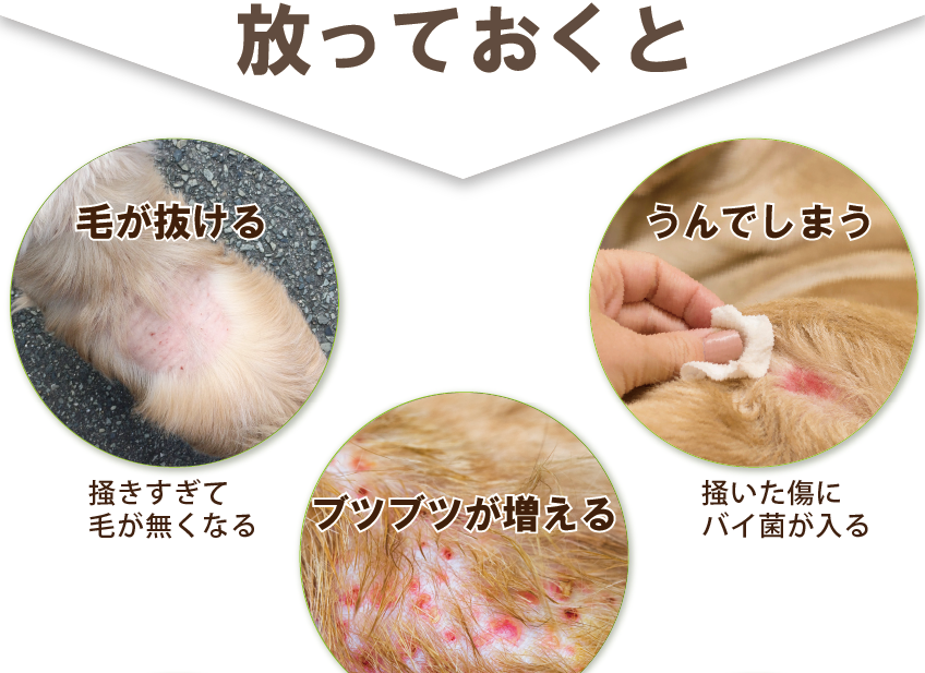 痒みを放っておくと、掻きむしって毛が抜けたり、血が出たり。